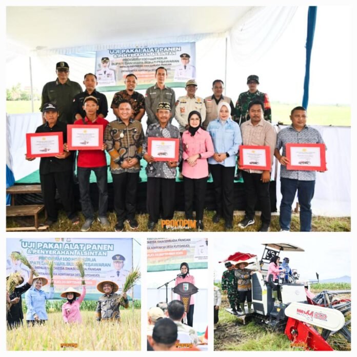 Dukungan ini tertuang langsung dalam agenda kunjungan kerja Bupati Pesawaran Nanda Indira B., S.E., M.M. bersama Wakil Bupati Antonius Muhammad Ali, S.H. di Desa Kutoarjo, Kecamatan Gedong Tataan, Jumat (3/10/2025), dalam rangka penyerahan Alat Mesin Pertanian (Alsintan) serta peninjauan produksi Pupuk Organik Cair (POC).