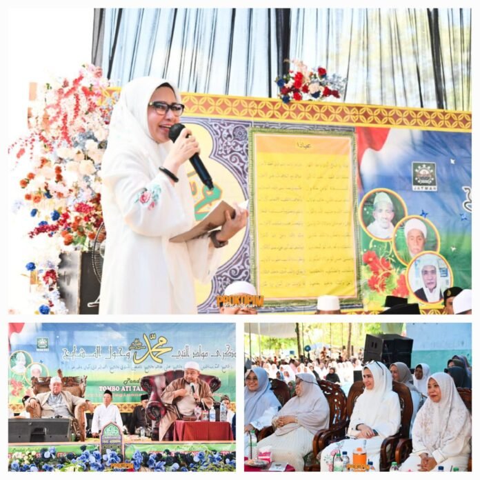 PESAWARAN|TERASTV.LIVE|, 15 September 2025 – Bupati Pesawaran Hj. Nanda Indira B, S.E., M.M. bersama jajaran menghadiri Pengajian Akbar dalam rangka Peringatan Maulid Nabi Muhammad SAW sekaligus Haul Masyayeikh yang digelar Pondok Pesulukan Tombo Ati Talangsebaya (TOAT) di Dusun Sambung Rejo, Desa Gerning, Kecamatan Tegineneng, Senin (15/9/2025).