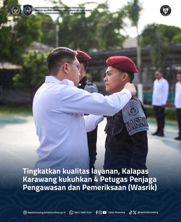 KARAWANG | TERASTV.LIVE | Kepala Lembaga Pemasyarakatan (Kalapas) Kelas IIA Karawang, Christo Toar, mengukuhkan empat petugas pengawasan dan pemeriksaan (wasrik) dalam apel pagi pegawai yang digelar di Lapangan Utama Lapas Karawang, Rabu (14/5).