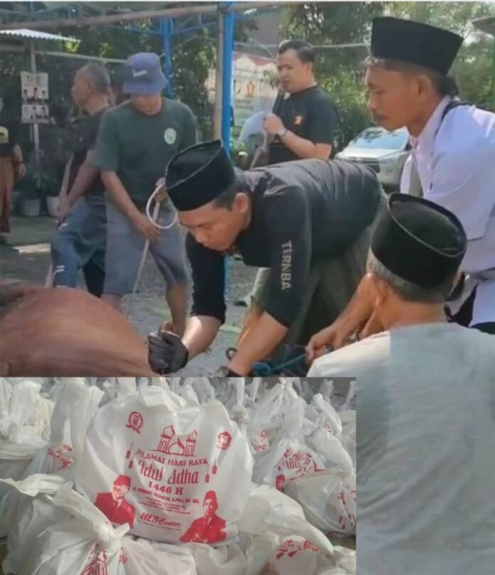KARAWANG | TERASTV.LIVE | Suasana Hari Raya Idul Adha 1446 Hijriah disambut dengan penuh khidmat oleh umat Muslim di berbagai penjuru, termasuk di Kabupaten Karawang. Di tengah semarak ibadah kurban, Ketua DPRD Karawang, H. Endang Sodikin, S.Pd.I., S.H., M.H., yang akrab disapa Kang HES, menunjukkan keteladanan dengan turun langsung menyembelih hewan kurban di kediamannya di kawasan Rawabagi, Kelurahan Palumbonsari, Karawang Timur.