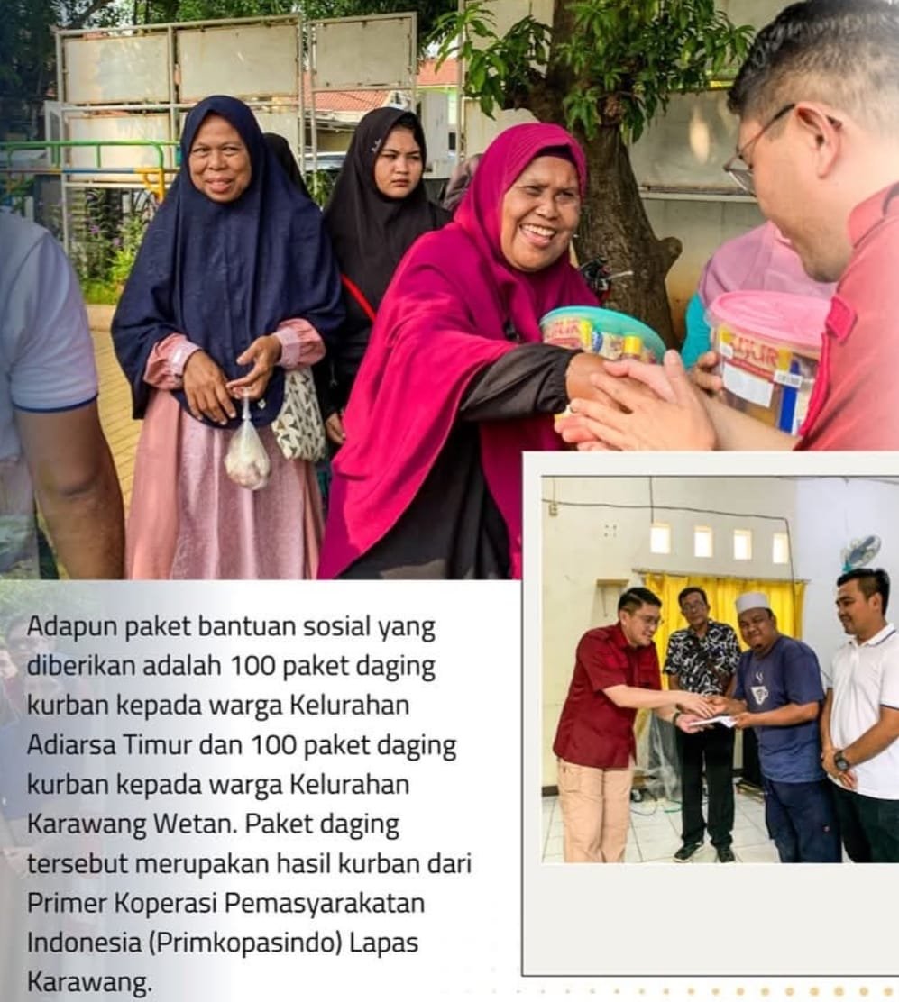 Sebanyak 100 paket daging diserahkan kepada warga Adiarsa Timur, sementara 100 paket lainnya dibagikan kepada warga Karawang Wetan. Seluruh bantuan berasal dari hasil penyembelihan hewan kurban yang dilaksanakan oleh Primer Koperasi Pemasyarakatan Indonesia (Primkopasindo) Lapas Karawang.