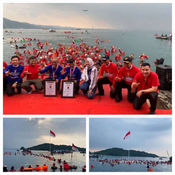 PESAWARAN|TERASTV.LIVE|, 16 Agustus 2025 – Sebuah momen bersejarah tercipta di perairan Pantai Mutun, Kecamatan Padang Cermin, Kabupaten Pesawaran. Sebanyak 565 perenang berhasil memecahkan rekor Museum Rekor Dunia Indonesia (MURI) lewat kegiatan Upacara Bendera Merah Putih di Permukaan Laut oleh Perenang Terbanyak pada Sabtu, (16/8/2025).