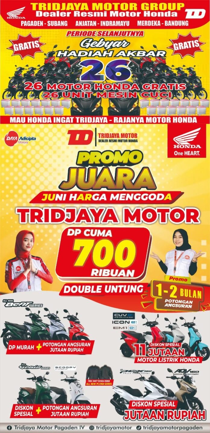 SUBANG : Tridjaya Motor Group, dealer resmi motor Honda terpercaya di Jawa Barat, kembali menghadirkan program spektakuler yang sayang untuk dilewatkan. Melalui program Gebyar Hadiah Akbar, Tridjaya akan membagikan 26 unit motor Honda dan 26 unit mesin cuci secara gratis kepada pelanggan setia selama tahun 2025 ini.
