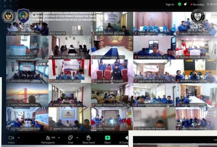 KARAWANG | JENDELAKITA.CLIK | Tim Satuan Operasional Kepatuhan Internal (Satops Patnal) bersama pejabat struktural Lembaga Pemasyarakatan (Lapas) Karawang mengikuti kegiatan Sosialisasi Surat Edaran Pengawasan Internal Pelaksanaan Penggeledahan Blok Hunian yang Aman dan Efektif secara virtual, Selasa (20/5), bertempat di Aula Sahardjo, Lapas Karawang. Kegiatan ini dipusatkan di Direktorat Jenderal Pemasyarakatan (Ditjenpas) Kementerian Hukum dan HAM RI, Jakarta.